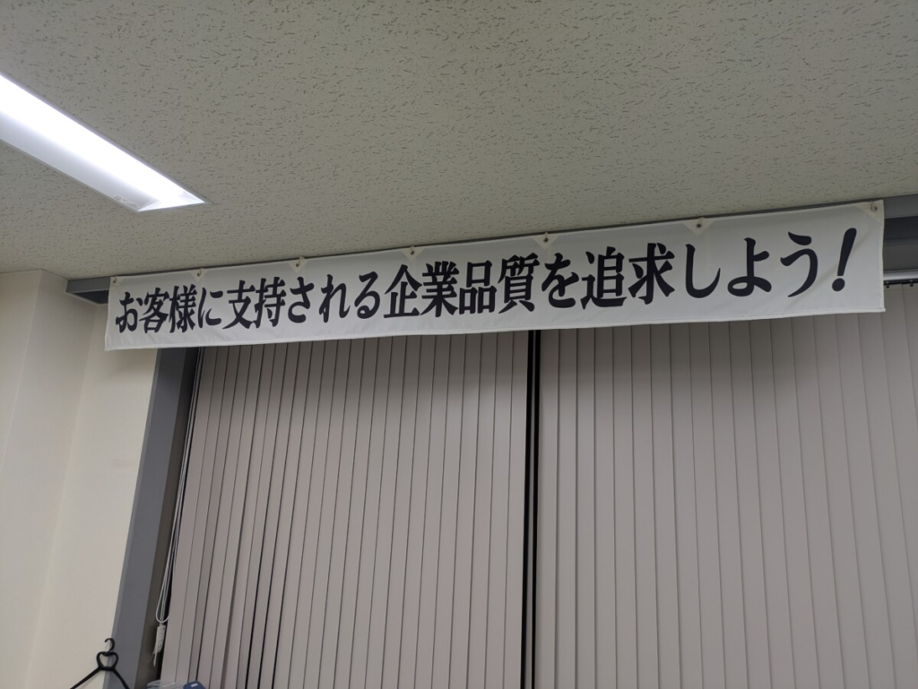 なので 「高い品質の追求は ミカド電装商事で働く人の義務ですよ」 ということを共有するために この横断幕を始めたというわけです