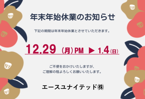 エースユナイテッド㈱は下記の通り年末年始休業と致します。 皆様には大変ご不便をおかけいたしますが、何卒ご理解の程お願い申し上げます。